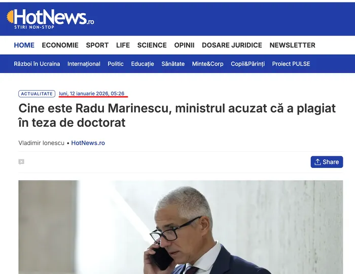 În doar 26 de minute de la publicarea articolului de către PressOne, Hotnews reușește să scrie și să publice, la ora 05:26 AM, un amplu material despre biografia lui Radu Marinescu. Îl găsiți aici: https://bit.ly/4jEpIYm. Felicitări Vladimir Ionescu pentru viteză și complexitate. Ziaristul a reușit în doar 26 de minute, la acea oră imposibilă a dimineții, să consulte mai multe surse online și să scrie un articol coerent.