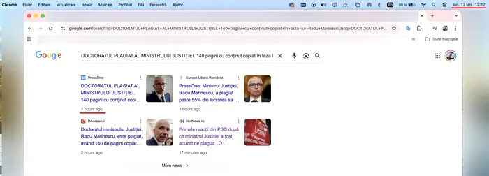 „PressOne publică la ora 5 dimineața (prima captură este făcută la ora 12:12, luni, 12 ianuarie, arătând că articolul PressOne era deja indexat de Google cu 7 ore mai devreme, deci cel puțin la ora 5:12 AM, dar cel mai probabil la 5:00) un articol despre faptul că Radu Marinescu, ministrul Justiției, și-a plagiat în mod grosolan teza de doctorat. Găsiți articolul Emiliei Șercan aici: http://bit.ly/4pCVYwi.