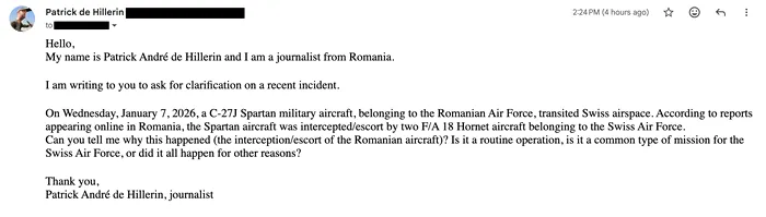 „Miercuri, 7 ianuarie 2026, o aeronavă militară C-27J Spartan, aparținând Forțelor Aeriene Române, a tranzitat spațiul aerian al Elveției. Conform unor relatări apărute în mediul online din România, aeronava Spartan a fost interceptată/escortată de către două aeronave F/A 18 Hornet aparținând Forțelor Aeriene ale Elveției.