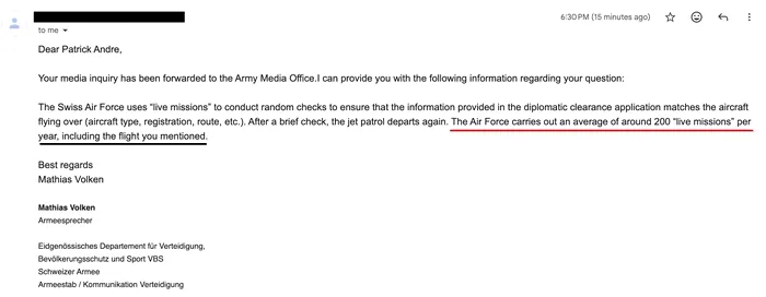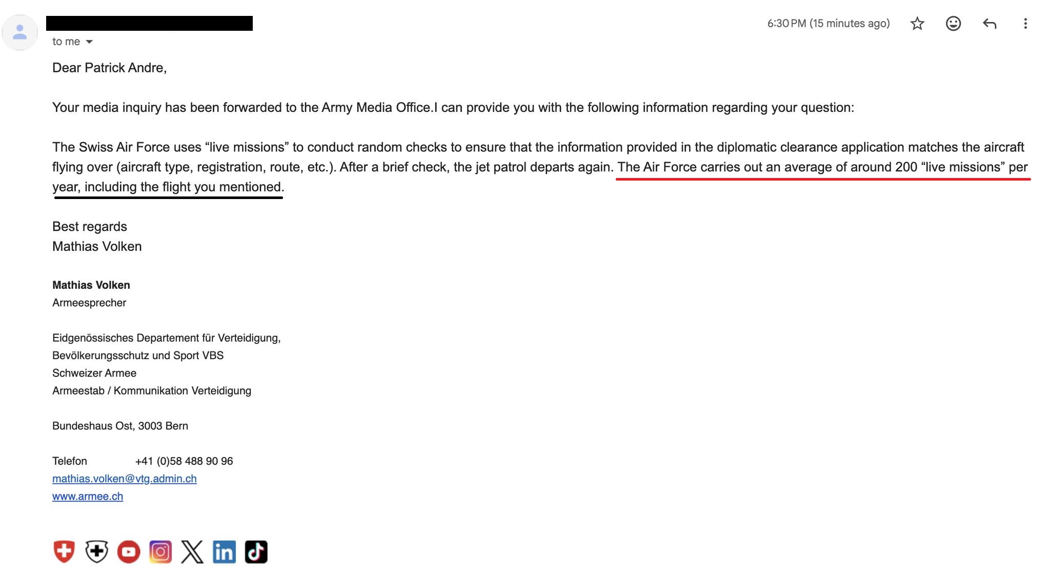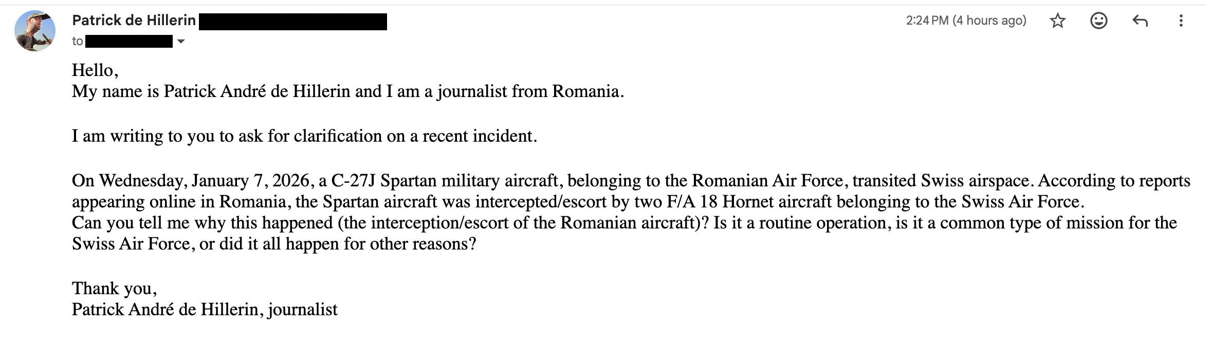 Jurnalistul relatează că a trimis o solicitare la biroul de presă al Armatei Elvețiene pentru a afla adevăratul motiv pentru care cele două aeronave au însoțit avionul prezidențial. C-27J Spartan.