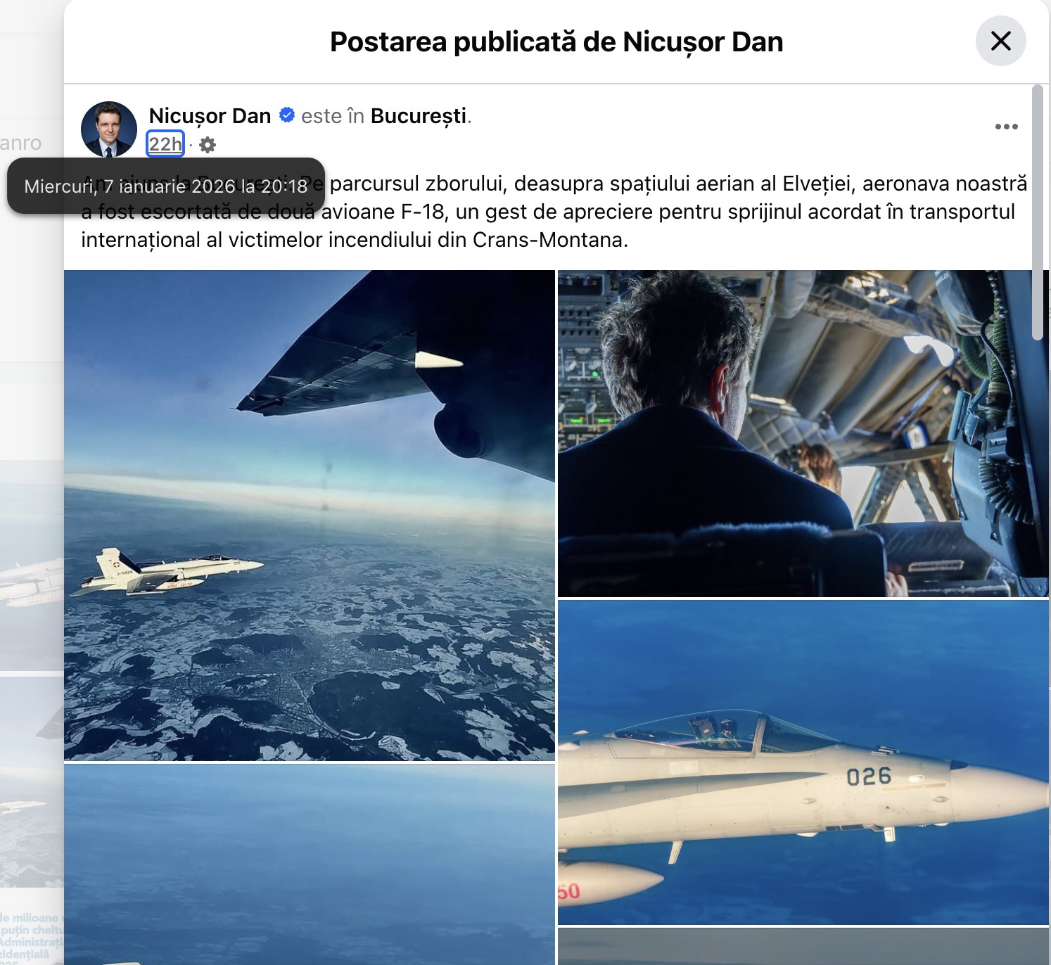 La întoarcerea de la Paris, Nicușor Dan a transmis pe social-media că aeronava Spartan în care se afla a fost escortată de două avioane ale Forțelor Aeriene Elvețiene și a publicat chiar și fotografii. Numai că, președintele Dan a și plusat: a spus că Elveția a făcut acest gest în semn de „recunoștință” față de ajutorul acordat de România cu transportul persoanelor rănite în tragedia din barul Constelalltion, în Crans Montana.