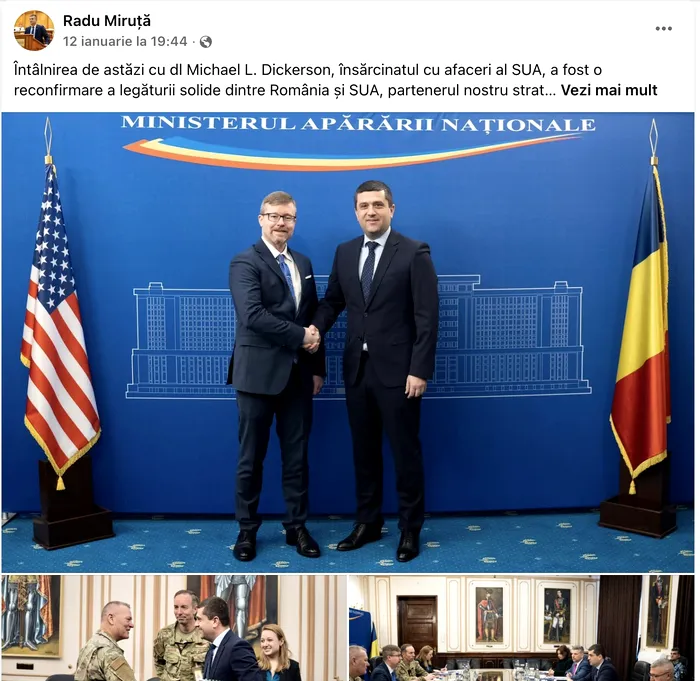 „La ceva timp după emisiune, la 19:44, Miruță postează pe Facebook despre vizita pe care i-a făcut-o la minister însărcinatul cu afaceri al SUA (ambasadorul interimar), Michael L. Dickerson. Pare o vizită inopinată, care ar fi avut loc în urma declarațiilor despre trimiterea de trupe în Groenlanda pe care le-a făcut Miruță la televizor. Poate nu e, poate era stabilită de multă vreme.