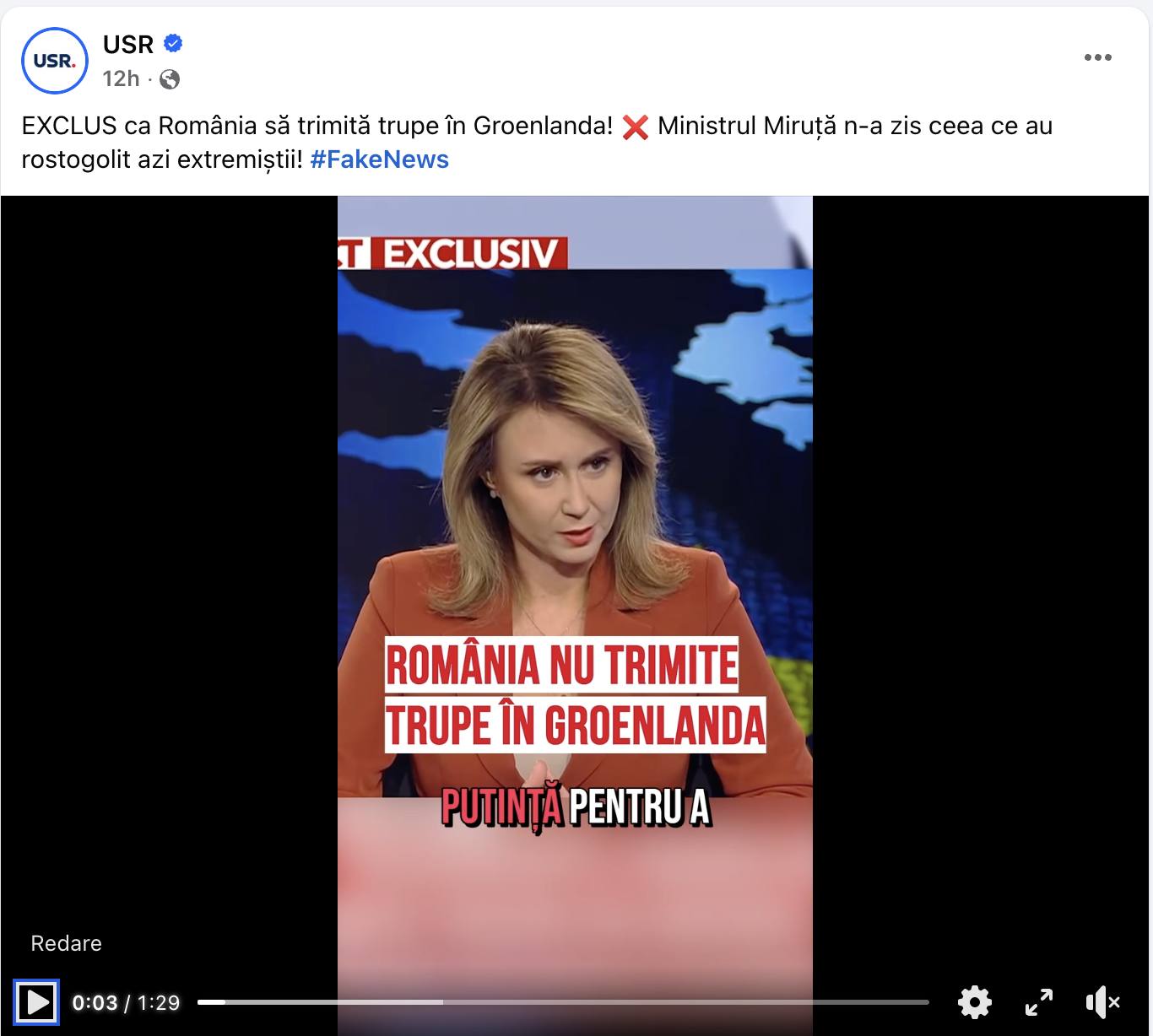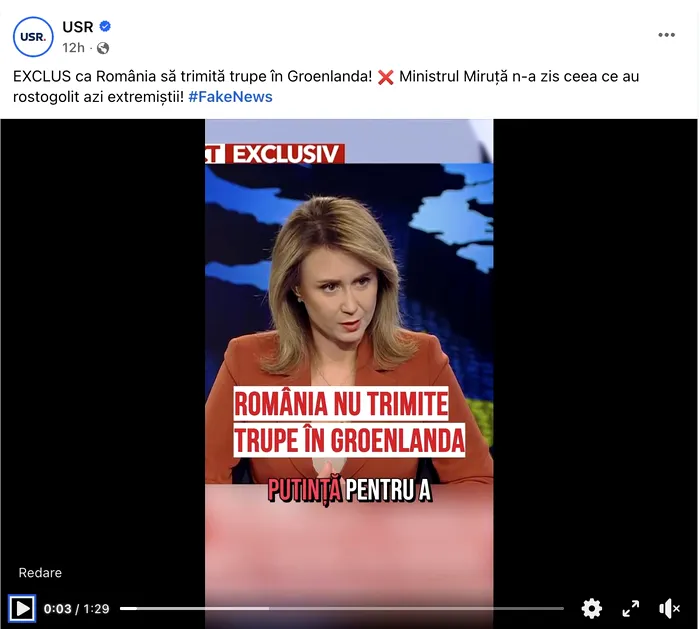 Mult mai grav este, însă, ceea ce urmează. În aceeași zi de marți, la ora 15:33, USR postase pe pagina oficială de Facebook a partidului un montaj video prin care dorea să demonstreze că Radu Miruță nu a zis nimic despre trimiterea de trupe în Groenlanda.