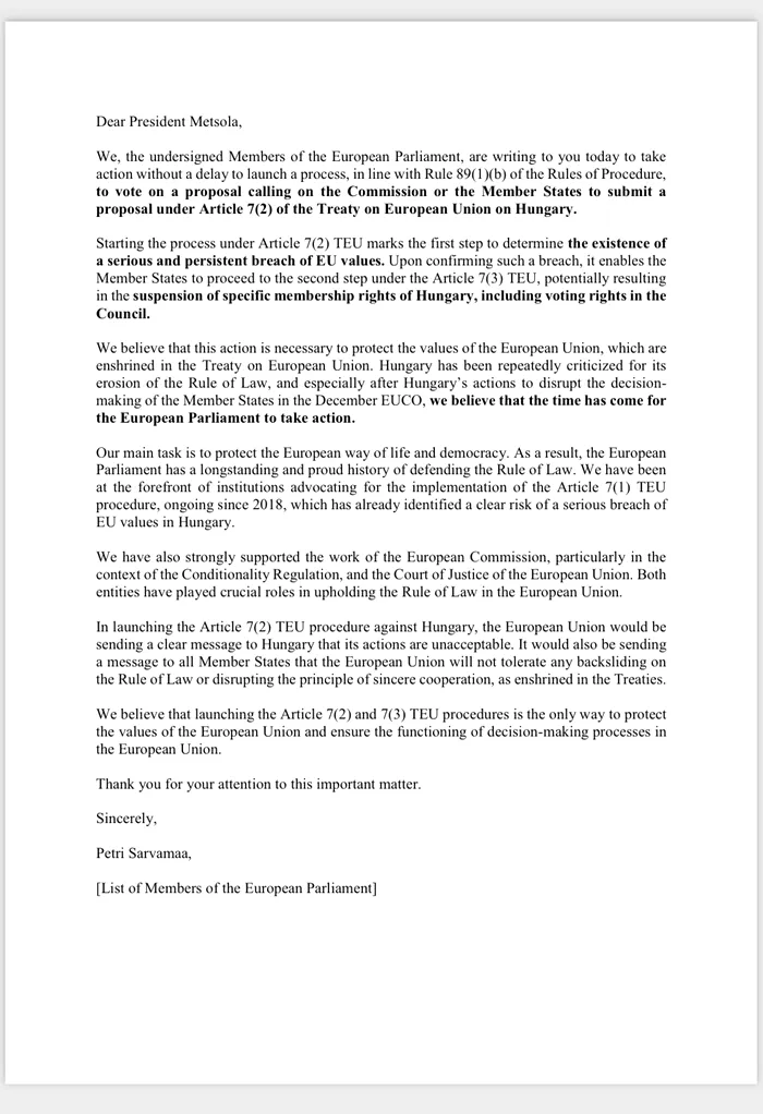 „Credem că această acțiune este necesară pentru a proteja valorile Uniunii Europene”, a scris Sarvamaa în scrisoare. Oficialul finlandez mai precizează că „acțiunile Ungariei nu fac altceva decât să perturbe procesul decizional al statelor membre”.