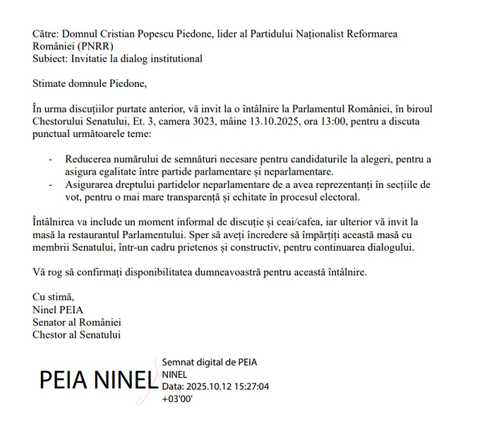 Cristian Popescu Piedone a primit o invitație să ia masa de prânz, la restaurantul din Parlament, luni. Senatorul AUR Ninel Peia i-a lansat invitația liderului PNRR. Este un dejun de lucru, în care cei doi politicieni vor vorbi despre drepturile partidelor neparlamentare.