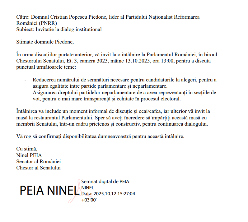 „Sper să aveți încredere să împărțiți această masă cu membrii Senatului, într-un cadru prietenos și constructiv, pentru continuarea dialogului”, îi transmite Peia lui Piedone.