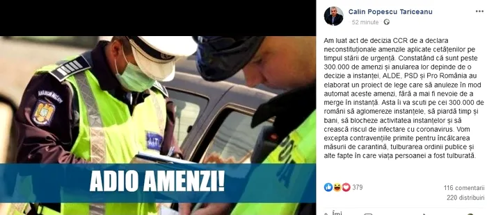 Tăriceanu scrie pe Facebook că a luat de „decizia CCR de a declara neconstituționale amenzile aplicate cetățenilor pe timpul stării de urgență”.