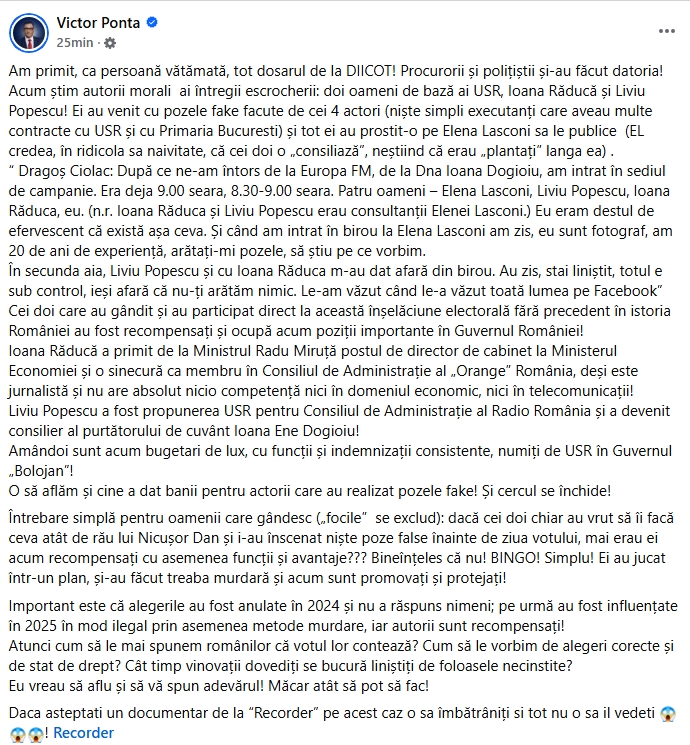 ”Am primit, ca persoană vătămată, tot dosarul de la DIICOT! Procurorii și polițiștii și-au făcut datoria! Acum știm autorii morali ai întregii escrocherii: doi oameni de bază ai USR, Ioana Răducă și Liviu Popescu! Ei au venit cu pozele fake facute de cei 4 actori (niște simpli executanți care aveau multe contracte cu USR și cu Primaria Bucuresti) și tot ei au prostit-o pe Elena Lasconi sa le publice (EL credea, în ridicola sa naivitate, că cei doi o „consiliază”, neștiind că erau „plantați” langa ea) .