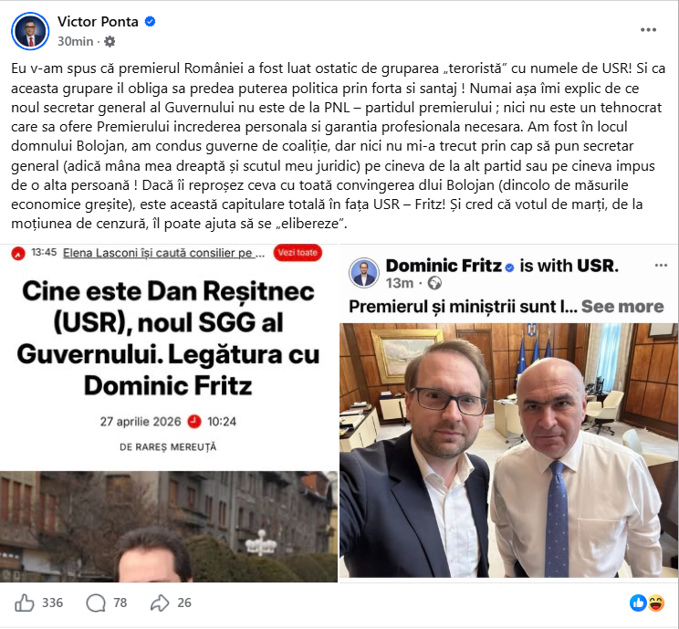 Supunerea lui Ilie Bolojan în fața USR-ului se manifestă chiar și în contextul moțiunii de cenzură pentru demiterea din fruntea Guvernului, este de părere Ponta. Potrivit acestuia, prin numirea unui membru USR, ca nou secretar general al Guvernului, Bolojan demonstrează că a devenit „ostaticul” formațiunii lui Fritz.