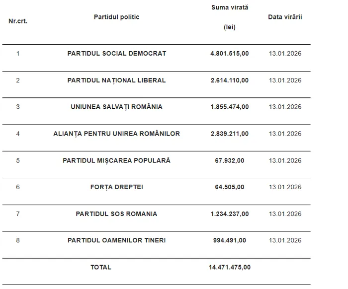 Autoritatea Electorală Permanentă (AEP) a dat publicităţii miercuri situaţia privind subvenţiile acordate partidelor politice de la bugetul de stat în luna ianuarie 2026. Potrivit sursei citate, suma totală depăşeşte 14,4 milioane de lei, cele mai mari sume fiind virate Partidului Social Democrat (PSD), peste 4,8 milioane de lei, şi Alianţei pentru Unirea Românilor, peste 2,8 milioane de lei.