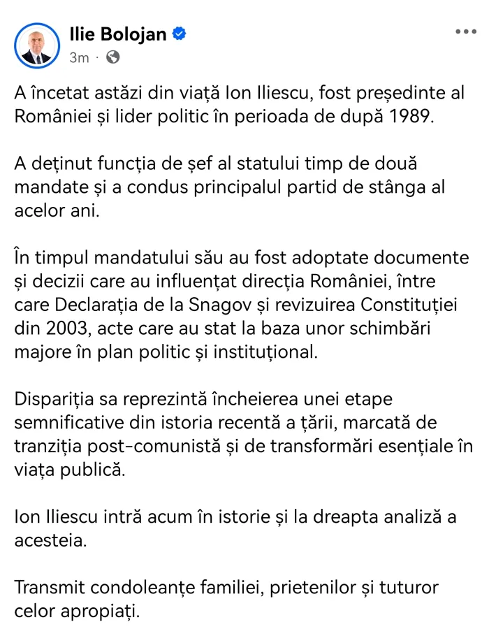 „A încetat astăzi din viață Ion Iliescu, fost președinte al României și lider politic în perioada de după 1989. A deținut funcția de șef al statului timp de două mandate și a condus principalul partid de stânga al acelor ani.