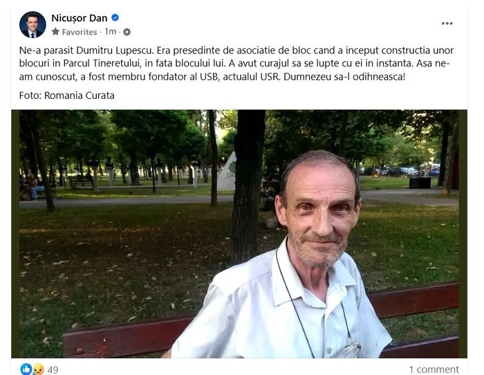Președintele Nicușor Dan a publicat, marți seară, un omagiu pe Facebook pentru președintele unei asociații de locatari din București. Dumitru Lupescu a fost, completează președintele, și membru fondator al Uniunii Salvați Bucureștiul (USB), precursorul USR.
