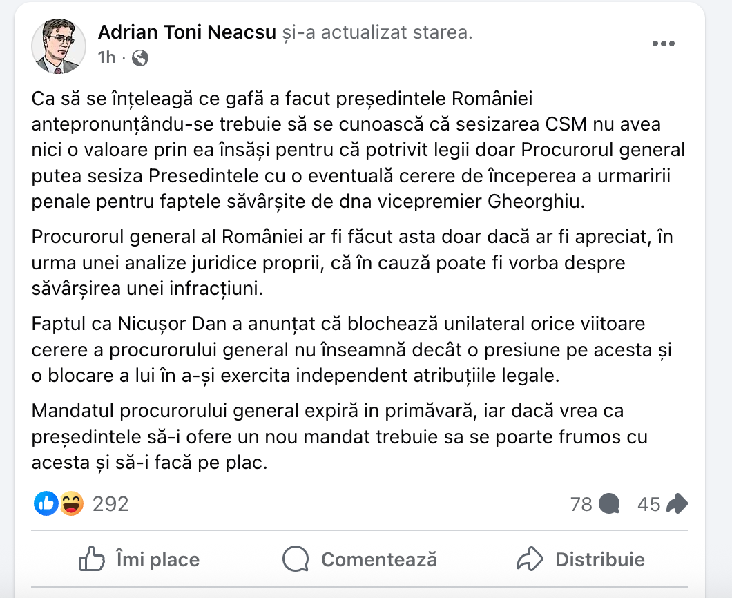 Faptul ca Nicușor Dan a anunțat că blochează unilateral orice viitoare cerere a procurorului general nu înseamnă decât o presiune pe acesta și o blocare a lui în a-și exercita independent atribuțiile legale.