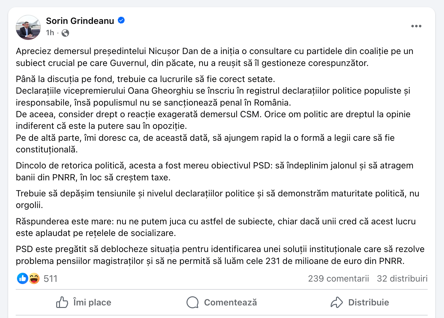 „Apreciez demersul președintelui Nicușor Dan de a iniția o consultare cu partidele din coaliție pe un subiect crucial pe care Guvernul, din păcate, nu a reușit să îl gestioneze corespunzător. Până la discuția pe fond, trebuie ca lucrurile să fie corect setate.