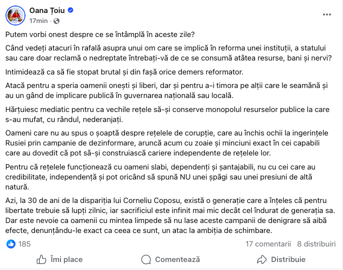 „Am rămas doar membru fondator, care potrivit statutului oferă apartenența la forma generală, nu la chestiuni de conducere. Nu există intererență între activitatea mea de acum”, a  mai declarat Oana Gheorghiu. Mai multe AICI