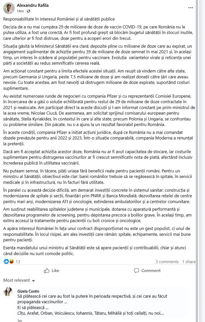 „Dacă am fi acceptat achiziția acestor doze, România nu ar fi avut capacitatea de stocare, iar costurile suplimentare pentru distrugerea vaccinurilor ar fi crescut semnificativ nota de plată, afectând inclusiv încrederea publică în utilitatea vaccinării. Nu puteam semna, în tăcere, plăți uriașe fără beneficii reale pentru pacienții români. Pentru un ministru al Sănătății, obiectivul este clar: banii românilor trebuie să se regăsească în spitale, în servicii medicale și în infrastructură, nu în facturi fără utilitate.În paralel cu această decizie dificilă, am demarat investiții concrete în sistemul sanitar: construcția și modernizarea de spitale și secții, finanțări prin PNRR și Banca Mondială, dezvoltarea rețelei de centre pentru mari arși, modernizarea ATI și oncologie, extinderea ambulatoriilor și a centrelor comunitare. Am susținut reabilitarea spitalelor județene și municipale, dotarea cu aparatură performantă și dezvoltarea programelor de screening, pentru depistarea precoce a bolilor grave. În același timp, am extins accesul la tratamente pentru pacienții cu boli cronice și oncologice. A apăra interesul României în fața unui contract disproporționat nu este un gest populist, ci unul de responsabilitate. În locul risipei, am ales investiții care rămân: spitale, echipamente, servicii mai bune pentru pacienți. Esența mandatului unui ministru al Sănătății este să apere pacienții și contribuabilii, chiar și atunci când deciziile nu sunt comode politic.”