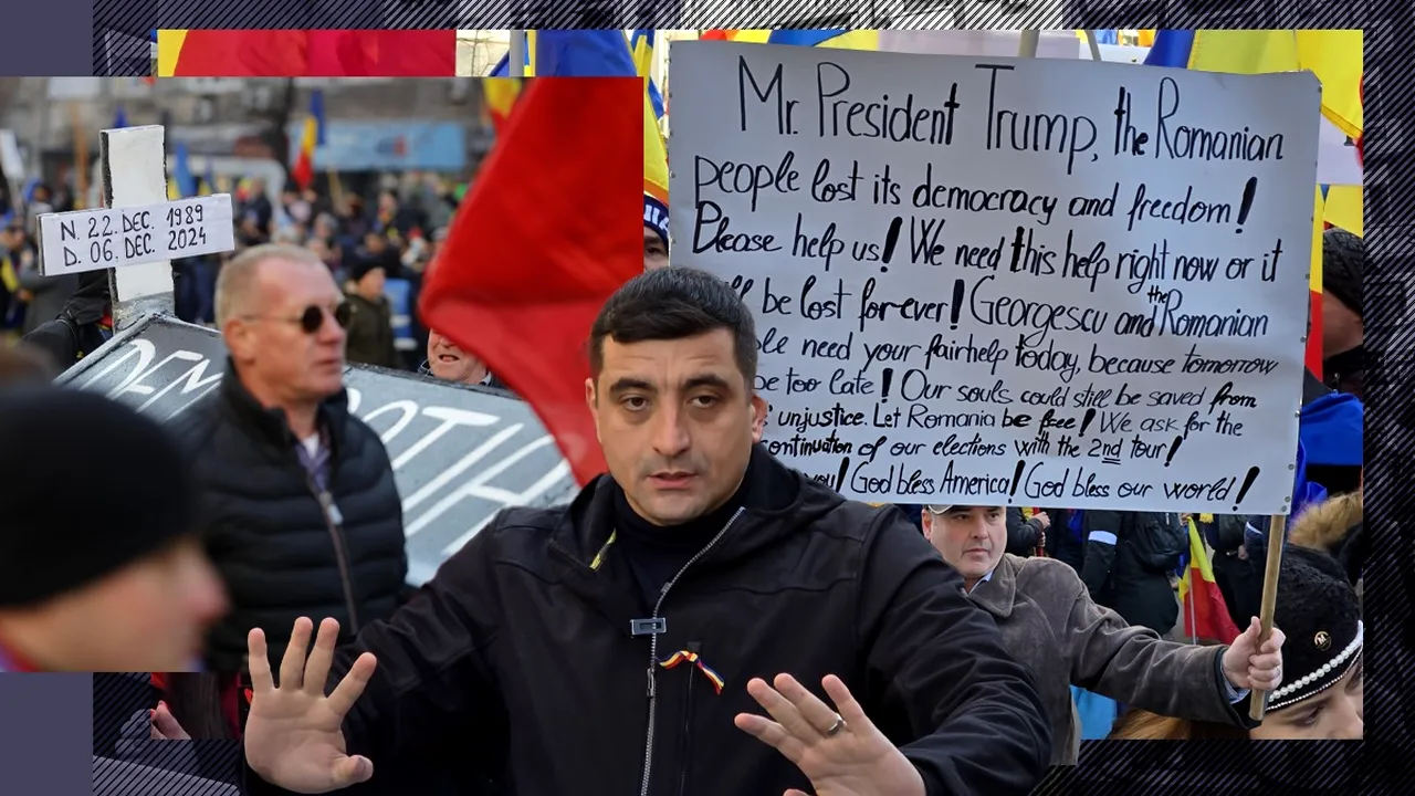 „Domnule președinte Trump, poporul român și-a pierdut democrația și libertatea. Vă rog, ajutați-ne!” este mesajul afișat de un manifestant în limba engleză.