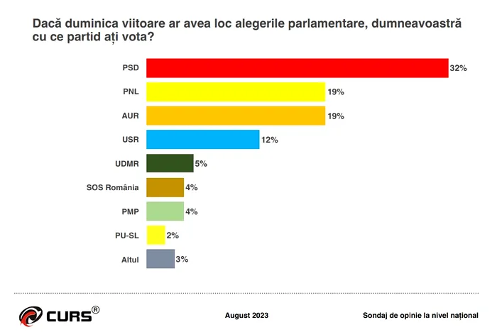 Sub pragul de 5% apar SOS România (4%), PMP (4%), PU-SL (2%) și altul (3%), potrivit rezultatelor sondajului.