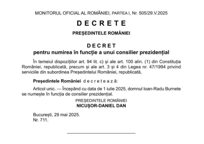 Radu Burnete, directorul executiv al Confederației Patronale Concordia, a fost numit consilier prezidențial de Nicușor Dan. Burnete și își va începe mandatul la Cotroceni la 1 iulie, a anunțat acesta printr-un mesaj pe Facebook, în care a publicat și decretul de numire, publică G4Media.