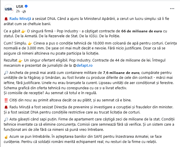 USR anunță pe pagina de Facebook că ministrul Apărării, Radu Miruță, ar fi descoperit nereguli grave în cadrul instituției pe care o conduce. Oficialul a anunțat Direcția Națională Anticorupție (DNA) cu privire la atribuirea unor contracte pentru echipament militar, în valoare de zeci de milioane de euro către o singură firmă. Potrivit USR-ului, presupusele nereguli sesizate de Miruță ar justifica necesitatea împrumutului SAFE de 17 miliarde de lei, intens criticat de sindicaliștii din domeniul Apărării.