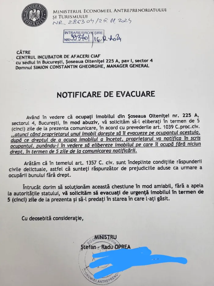 Radu Oprea, fostul ministru al Economiei, Antreprenoriatului și Turismului în Guvernul Ciolacu 1, a publicat pe pagina sa de Facebook un document semnat în perioada în care ocupa această funcție, referitor la „clădirea fantomă” a Ministerului Economiei. Este vorba despre o notificare de evacuare transmisă în decembrie 2024 către Centru Incubator de Afaceri CIAF, în care Radu Oprea atrăgea atenția societății că ocupă imobilul din Șoseaua Olteniței „în mod abuziv” și cerea evacuarea lui în cel mult cinci zile.