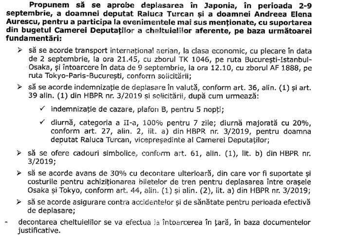 „Propunem să se aprobe deplasarea în Japonia, în perioada 2-9 septembrie, a doamnei deputat Raluca Turcan și a doamnei Andreea Elena Aurescu, pentru a participa la evenimentele mai sus menționate, cu suportarea din bugetul Camerei Deputaților a cheltuielilor aferente, pe baza următoarei fundamentări: