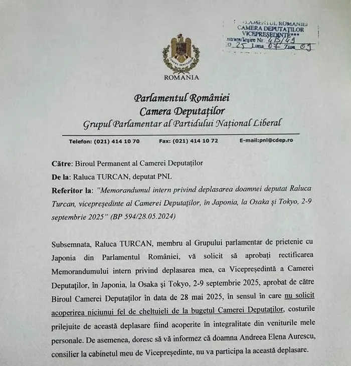 Fosta ministră a Culturii, liberala Raluca Turcan, a solicitat în luna mai conducerii Parlamentului decontarea cheltuielilor pentru o deplasare în Japonia, în perioada 2-9 septembrie 2025, cu scopul de a participa la concertul Orchestrei Operei Naționale București din cadrul Expo 2025 Osaka, programat pentru 4 septembrie. În documentul transmis, vizita era justificată prin necesitatea „consolidării dialogului bilateral și promovarea cooperării instituționale, economice, educaționale și culturale între România și Japonia”. Asta în contextul în care Ilie Bolojan a transmis miercuri un memorandum intern prin care cere limitarea deplasărilor externe finanțate din bani publici în instituțiile subordonate.