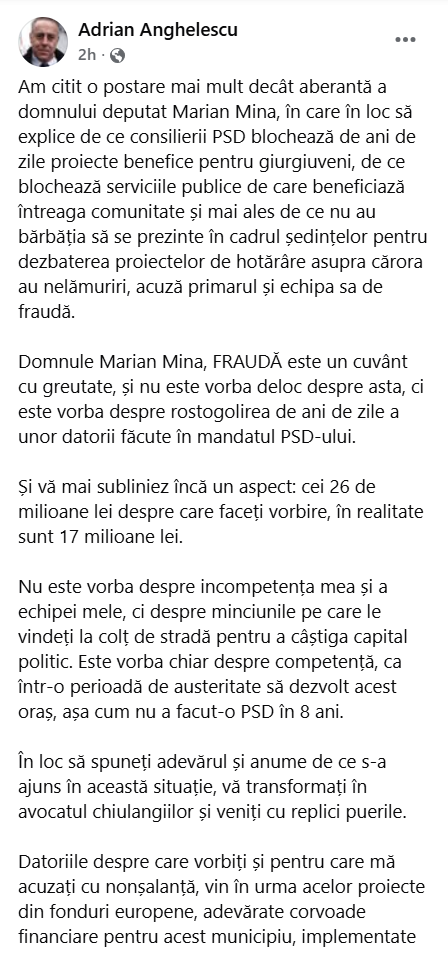 Primarul liberal Adrian Anghelescu a reacționat pe Facebook, acuzându-l direct pe liderul PSD Giurgiu, Marian Mina, că datoria a fost generată în perioada în care social-democrații conduceau orașul.