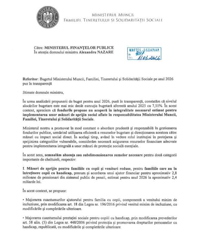 Potrivit documentului transmis către ministrul Finanțelor, alocările pentru 2026 sunt cu 7,51% mai mici decât execuția bugetară din 2025, ceea ce riscă să afecteze implementarea unor programe sociale importante.