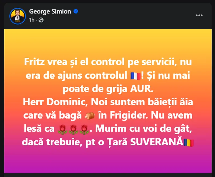 ”Fritz vrea şi el control, pe servicii, nu era de ajuns controlul Franței. Şi nu mai poate de grija AUR. (…) Murim cu voi de gât, dacă trebuie, pentru o ţară suverană”, scrie președintele AUR, pe Facebook.