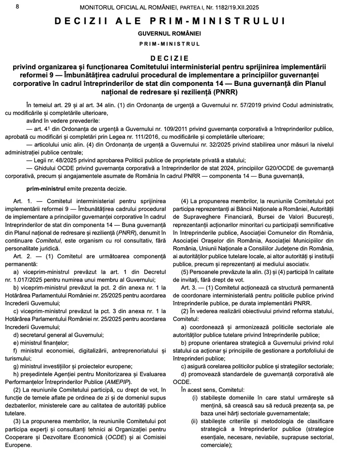 • Decizie privind organizarea și funcționarea Comitetului Interministerial pentru sprijinirea implementării Reformei 9 – Îmbunătățirea cadrului procedual de implementare a principiilor guvernanței corporative în cadrul întreprinderilor de stat din componenta 14 – Buna guvernanță din Planul Național de Redresare și Reziliență.