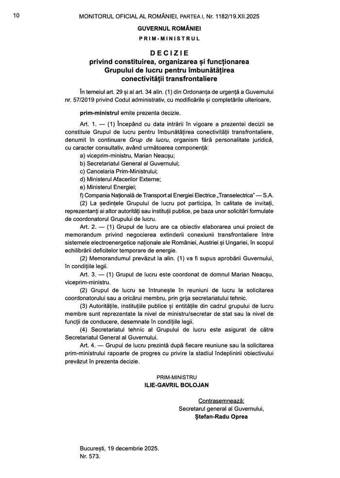 Decizie privind constituirea și funcționarea Grupului de lucru pentru îmbunătățirea conectivității transfrontaliere