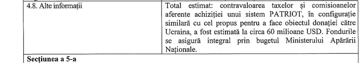 De asemenea, Ministerul Apărării va iniția demersurile necesare pentru a înlocui sistemul donat cu unul similar, achiziționat din Statele Unite prin programul Foreign Military Sales (FMS).