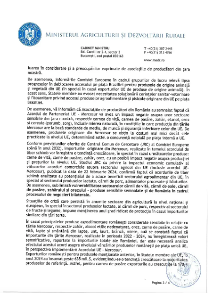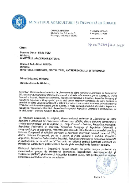 Ministrul Agriculturii, Florin Barbu, a refuzat să semneze Memorandumul privind acordul Mercosur și a transmis documentul nesemnat, după ce a avertizat în repetate rânduri că lipsa unor clauze clare de protecție a fermierilor va afecta grav agricultura românească. Barbu a cerut garanții privind respectarea standardelor europene de siguranță alimentară, protecția mediului și bunăstarea animalelor pentru produsele importate din statele Mercosur.