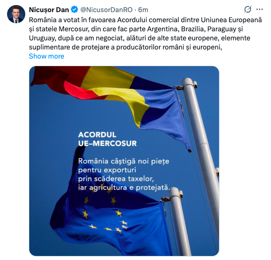 Președintele României a confirmat că România a votat în favoarea acordului, după negocieri suplimentare cu alți lideri europeni. Șeful statului spune că acordul aduce beneficii economice importante, dar include și măsuri clare de protecție pentru fermierii români.