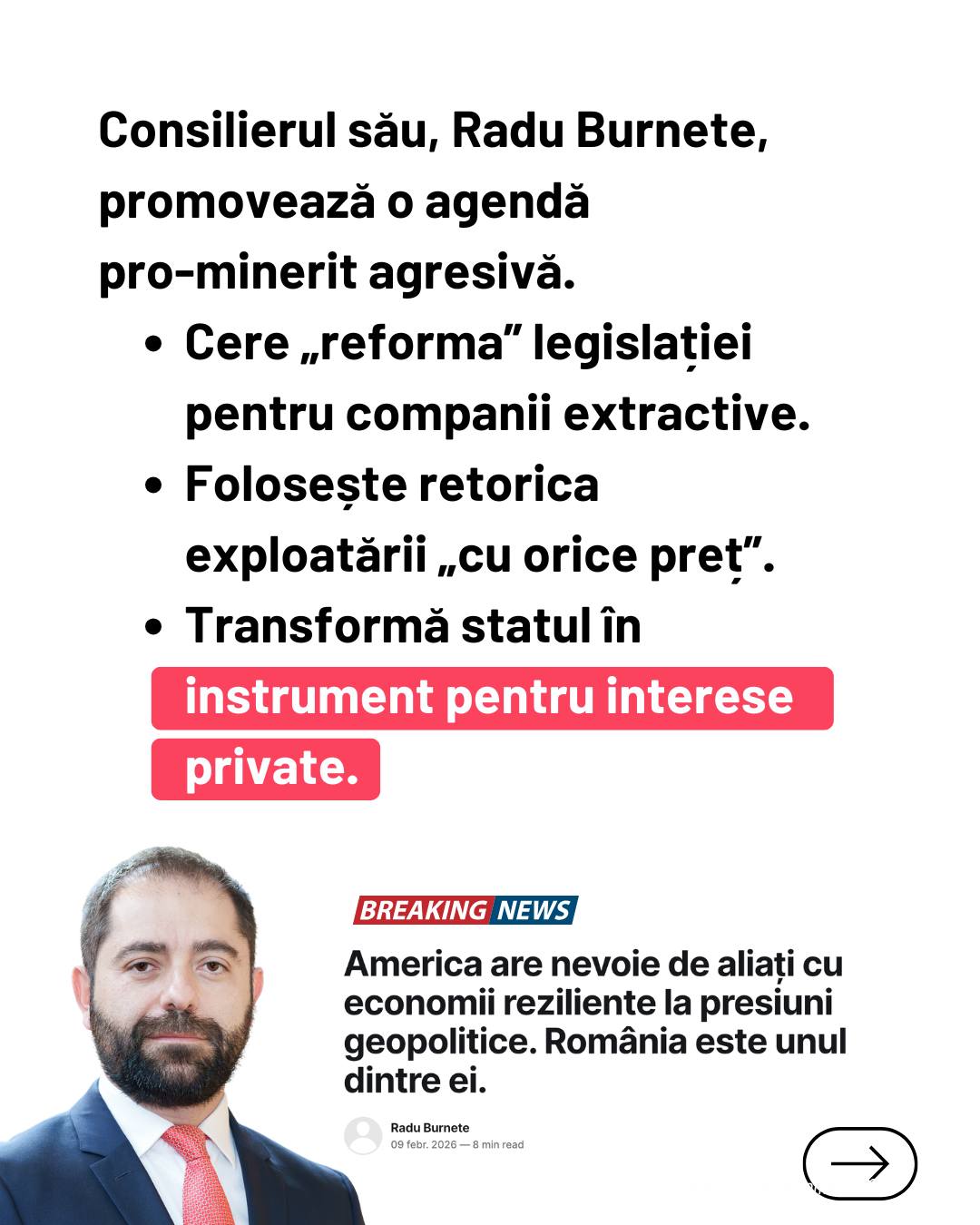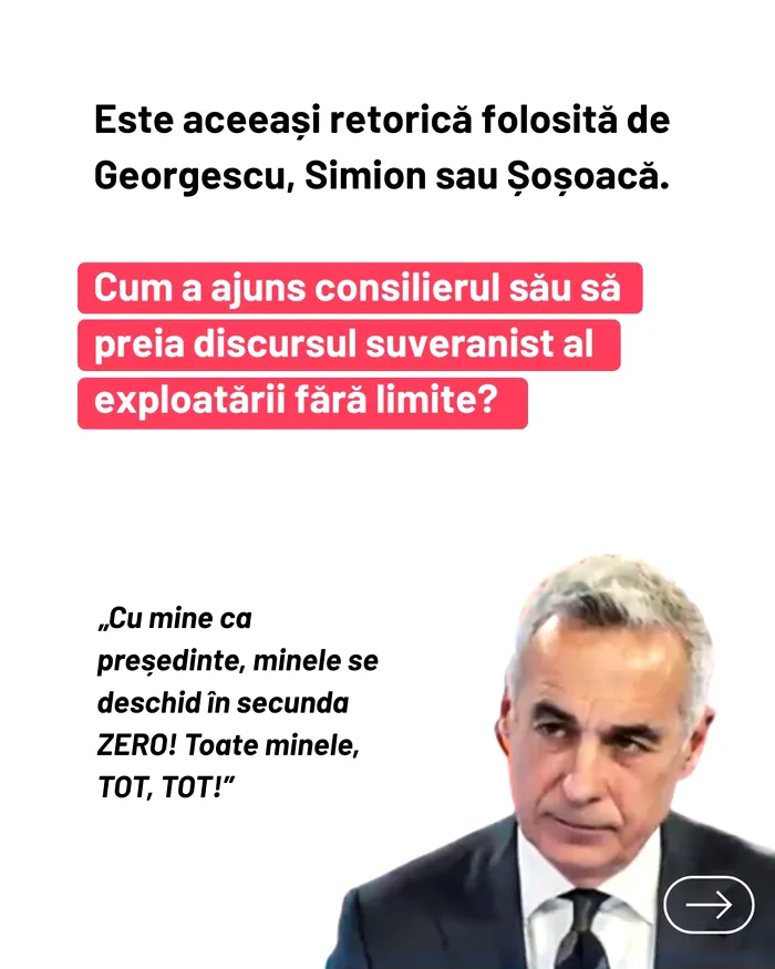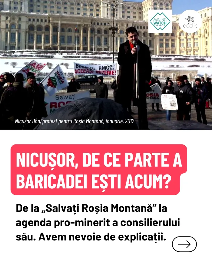 Astăzi însă, chiar din interiorul echipei sale, se promovează o agendă care ne ridică serioase semne de întrebare: 𝗺𝗶𝗻𝗲𝗿𝗶𝘁 𝗰𝘂 𝗼𝗿𝗶𝗰𝗲 𝗽𝗿𝗲𝘁̦ 𝘀̦𝗶 𝗳𝗮𝗰𝗶𝗹𝗶𝘁𝗮̆𝘁̦𝗶 𝗽𝗲𝗻𝘁𝗿𝘂 𝗰𝗼𝗺𝗽𝗮𝗻𝗶𝗶 𝗲𝘅𝘁𝗿𝗮𝗰𝘁𝗶𝘃𝗲. Asta înseamnă exproprieri, presiune pe comunități și riscuri majore pentru mediu”, se arată în postarea de pe pagina Declic.