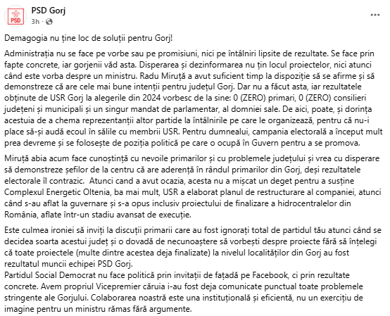 Mai mult, PSD Gorj îl acuză pe Radu Miruță că nu a acționat pentru salvarea CE Oltenia. Aceștia susțin că USR a elaborat planul de restructurare a companiei în perioada în care se afla la guvernare. Tot social-democrații spun că USR s-a opus finalizării unor hidrocentrale aflate în stadiu avansat de execuție.