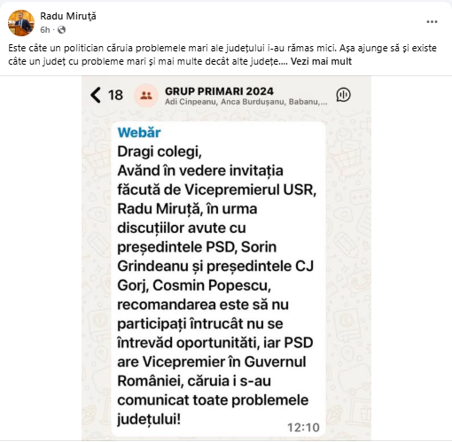Radu Miruță, care este și deputat de Gorj, a publicat pe Facebook o fotografie cu un mesaj transmis de liderul PSD Gorj, Mihai Weber, de pe un grup de primari PSD, în care edililor li se transmite că „în urma discuțiilor cu președintele PSD, Sorin Grindeanu, și cu președintele CJ Gorj, Cosmin Popescu, recomandarea este să nu participați” la întâlnirea cu viceprimarul USR.