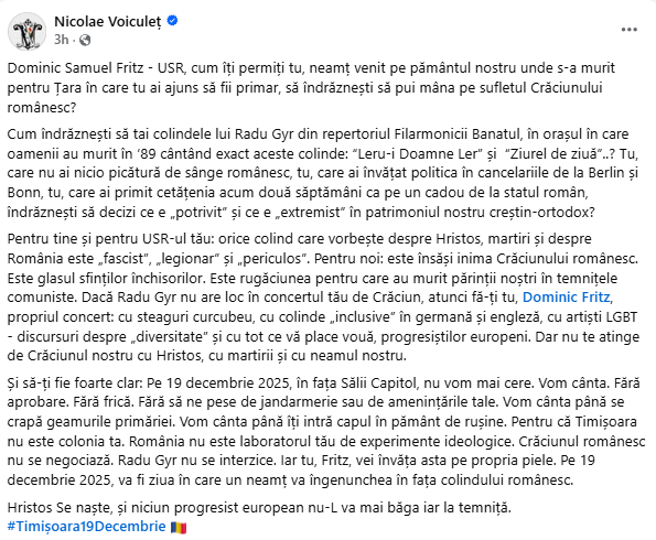 Artistul Nicolae Voiculeț a lansat o serie de critici dure la adresa primarului Timișoarei, Dominic Fritz, după ce edilul a impus Filarmonicii din Timișoara să scoată din repertoriu colindele poetului Radu Gyr, cunoscut pentru propagandă legionară în epoca interbelică.
