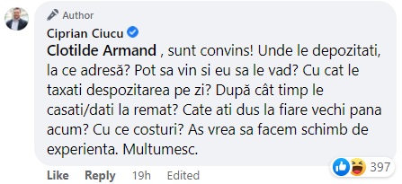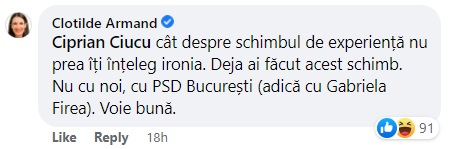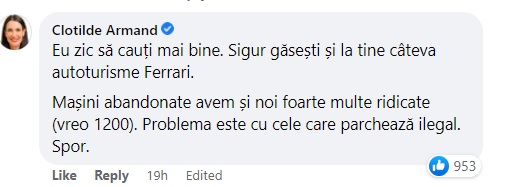 Clotilde Armand a reacționat, apoi, direct la postarea edilului Sectorului 6: „Eu zic să cauţi mai bine. Sigur găseşti şi la tine câteva autoturisme Ferrari. Maşini abandonate avem şi noi foarte multe ridicate (vreo 1200). Problema este cu cele care parchează ilegal. Spor!”.