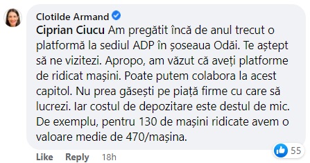 „Fac ceva greşit, ceva îmi scapă. De când am venit primar am înfiinţat de la zero un serviciu de ridicare de maşini. Cu regulament nou, cu resurse alocate, am identificat mii de rable pe care le-am notificat (ştiti procedura aceea de 7 luni), am facut rost de teren pentru depozitare, contracte cu remat-ul etc. Ce-i drept, ne-am focalizat pe maşinile abandonate. Noi am ridicat cca. 1200 şi alte mii au fost luate de pe spaţiul public de către proprietari în urma notificărilor (iminenţa ridicării). Acum avem o baza de date cu încă 1500 de maşini ce aşteaptă să facă sorocul şi să le ducem la remat. Ce vreau să spun… al dracului, n-am prins şi noi un Ferrari!”, a scris Ciucu.
