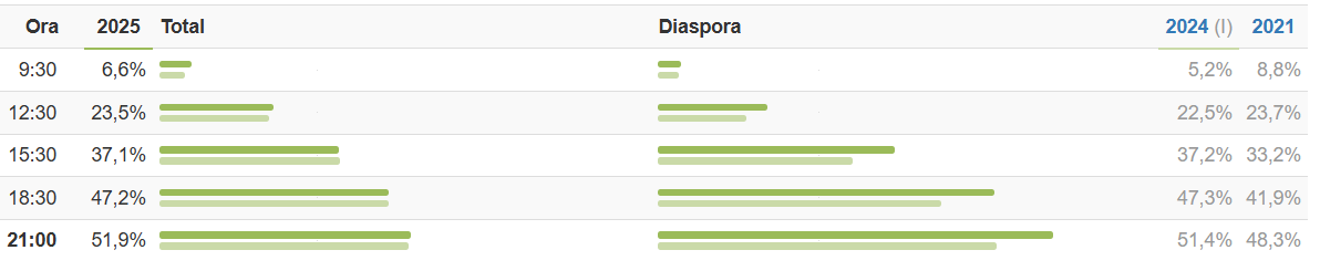 În diaspora, au fost numerate voturile în peste 250 de secții, din cele 301 deschise. Se așteaptă procesele verbale din Statele Unite, unde au fost deschise 23 de secții, și din Canada (8 secții).