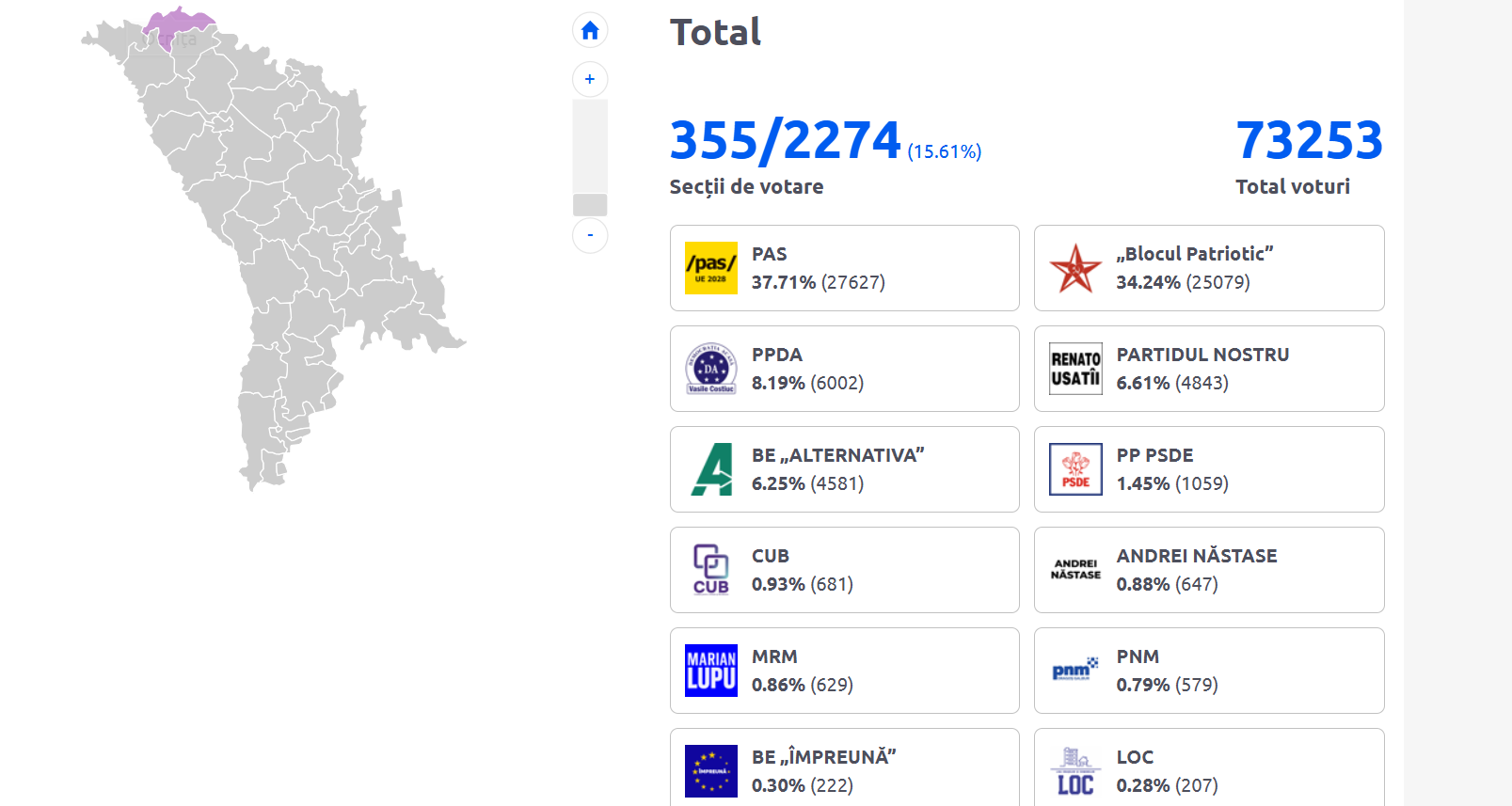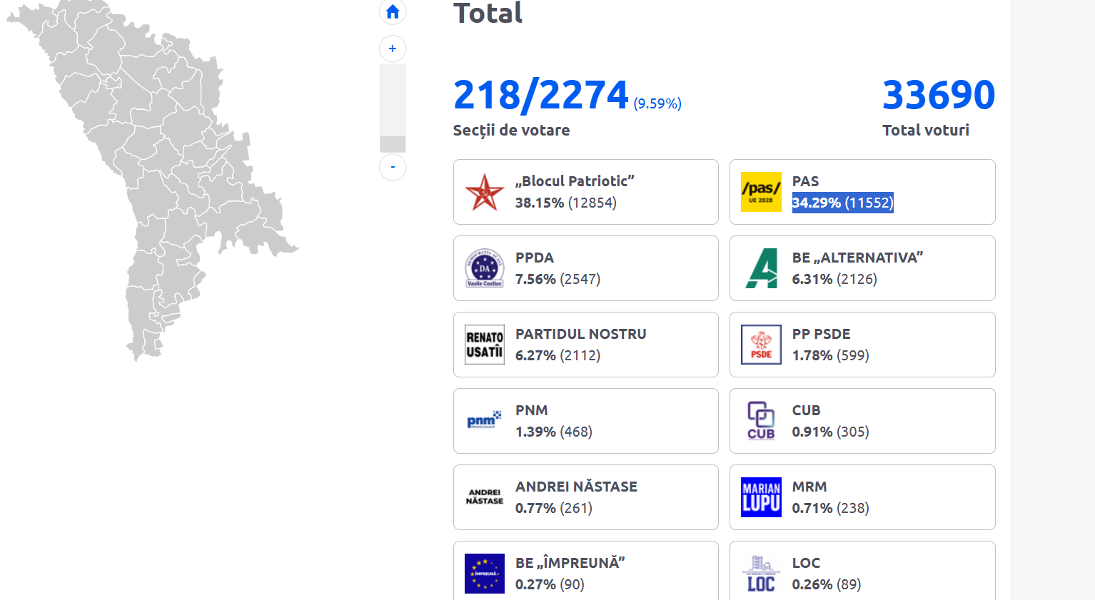 Potrivit cifrelor publicate, partidul Maiei Sandu – „Acțiune și Solidaritate” – ar obține peste 20% din voturi. Surpriza ar reprezenta-o formațiunea condusă de fostul primar al orașului Bălți, Renato Usatîi.