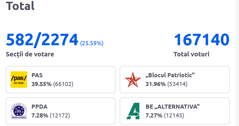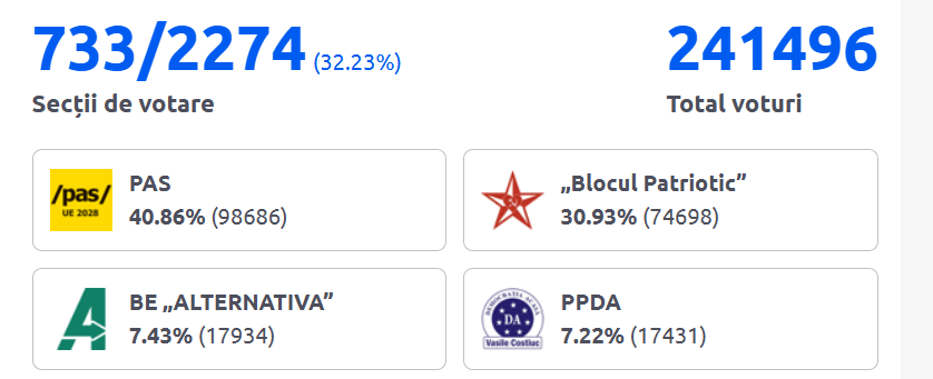 Este de așteptat ca scorul PAS să crească pe măsură ce sunt numărate voturile din diaspora, unde partidul pro-european și președinta sa, Maia Sandu, s-au bucurat de un sprijin solid în alegerile precedente.