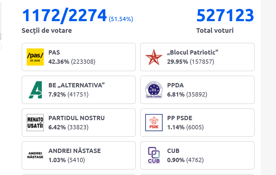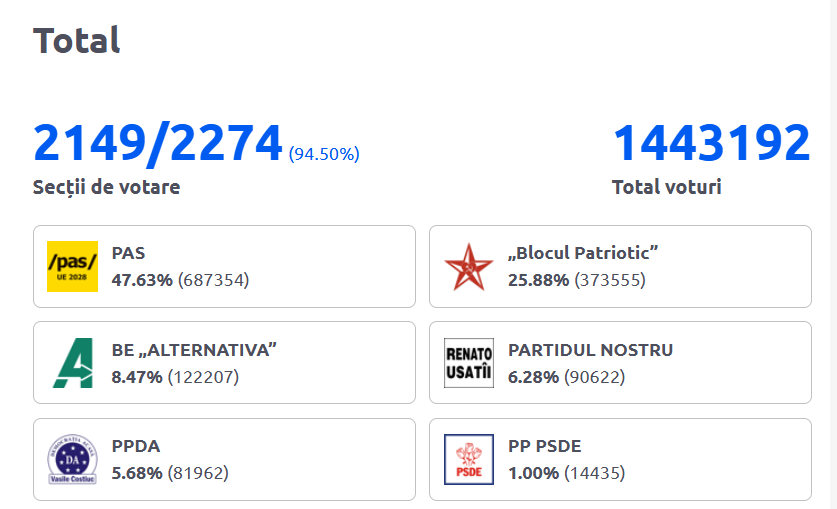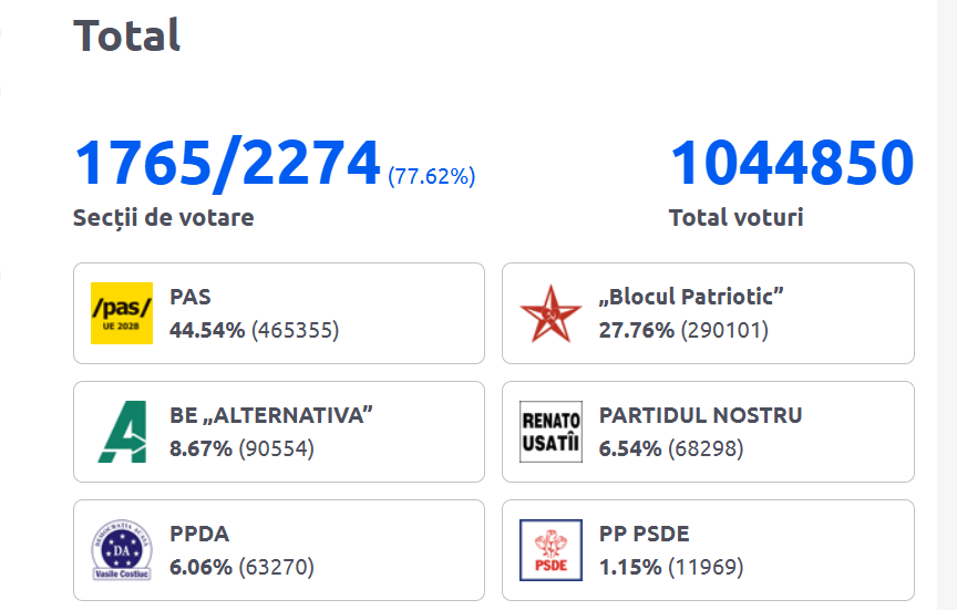 S-au centralizat aproape 99% din procesele verbale. PAS obține 49.63% (769.911), iar Blocul Patriotic”, 24.51% (380213).