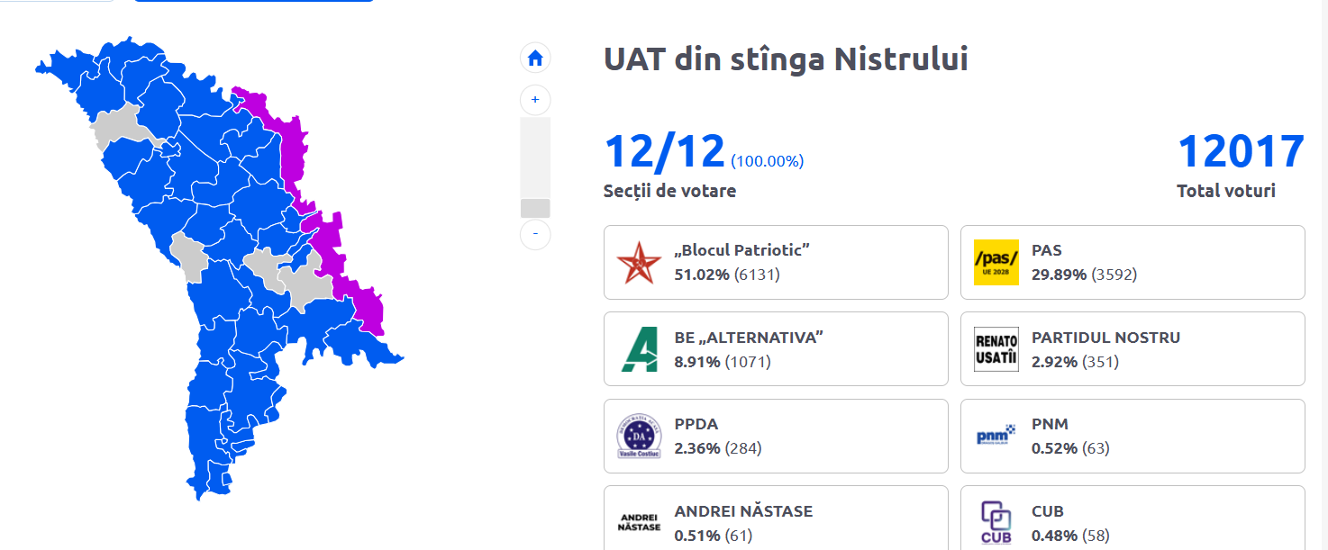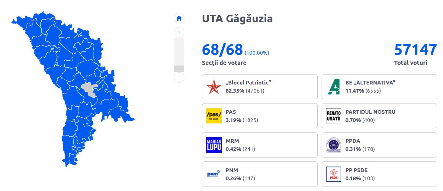 Comisia Electorală Centrală din Republica Moldova a finalizat numărarea voturilor la secțiile de votare din Regiunea Autonomă Găgăuză, unde Blocul Patriotic pro-rus a câștigat 82.35% (47061 voturi).