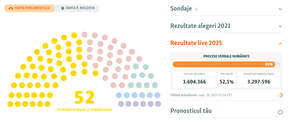 Conform simulatorului electoral al Europei Libere, aceste rezultate indică că PAS ar putea obține 52 de mandate în viitorul Parlament, scrie Mediafax.