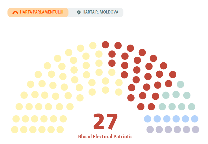 • Blocul Electoral „Patriotic”, constituit din Partidul Socialiștilor, Partidul Comuniștilor, Partidul Inima Moldovei și Partidul Viitorul Moldovei – 13,9%.