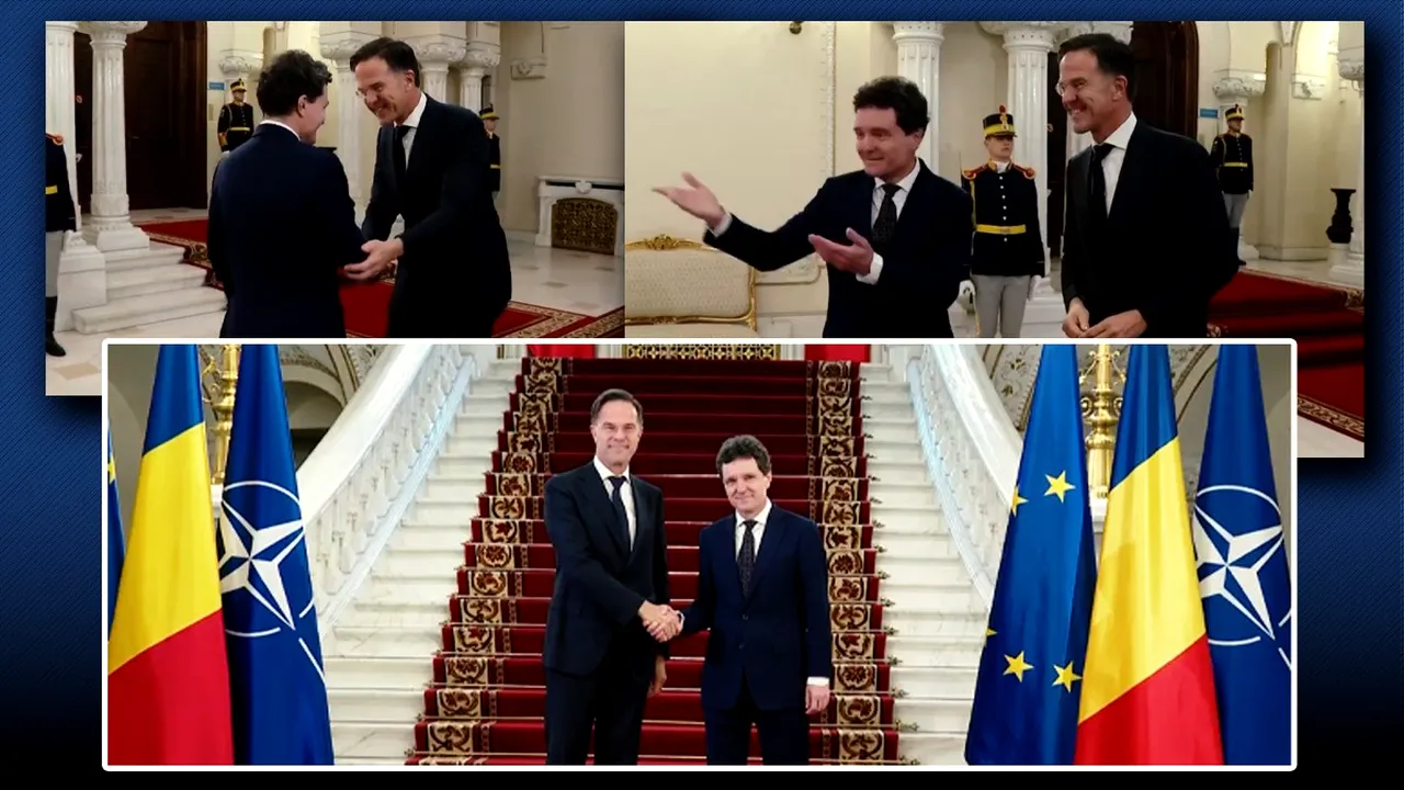 Bolojan i-a prezentat lui Rutte Holul de Onoare din Guvern, unde cei doi nu au stat mai mult de 2 minute, grație jurnaliștilor care fotografiau întâlnirea, până să urce în Cabinetul premierului la discuții. În spatele celor doi oficiali se afla și ministrul Apărării, Ionuț Moșteanu, alături de delagația NATO.