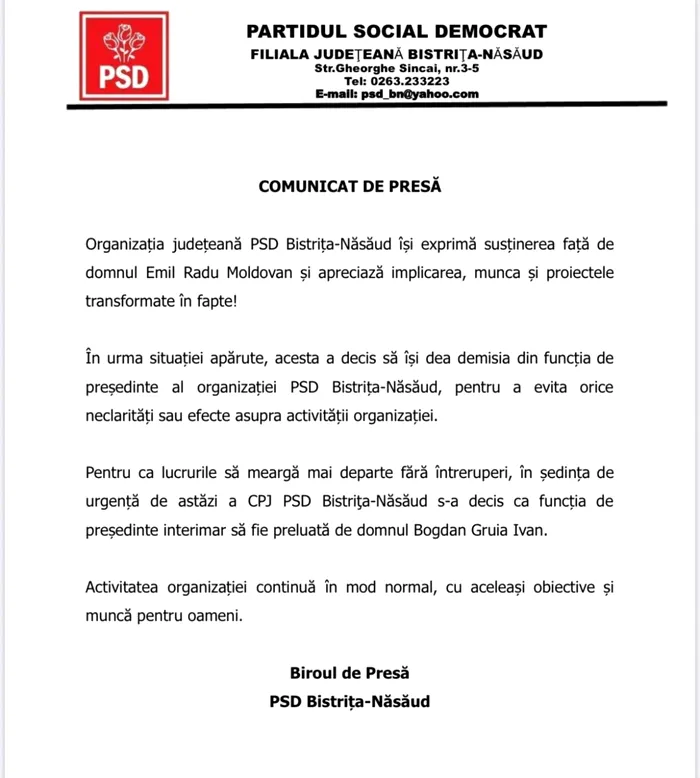 Șeful Consiliul Județean Bistrița-Năsăud, Radu Moldovan, a demisionat, miercuri, din funcția de președinte al organizației PSD Bistrița-Năsăud în urma perchezițiilor DNA.